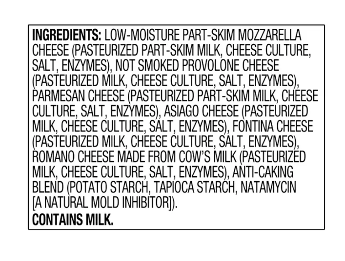 - Blend of low-moisture part-skim mozzarella, non-smoked provolone, parmesan, romano, fontina, and asiago cheeses