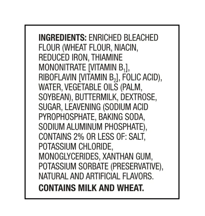 ENRICHED BLEACHED FLOUR (WHEAT FLOUR, NIACIN, REDUCED IRON, THIAMIN MONONITRATE [VITAMIN B1], RIBOFLAVIN [VITAMIN B2], FOLIC ACID), WATER, VEGETABLE OIL (PALM, SOYBEAN), DEXTROSE, SUGAR, LEAVENING (SODIUM ACID PYROPHOSPHATE, BAKING SODA, SODIUM ALUMINUM PHOSPHATE), CONTAINS LESS THAN 2% OF SALT, BUTTERMILK, POTASSIUM CHLORIDE, MONOGLYCERIDES, XANTHAN GUM, POTASSIUM SORBATE (PRESERVATIVE), NATURAL AND ARTIFICIAL FLAVOR. CONTAINS: MILK, WHEAT.