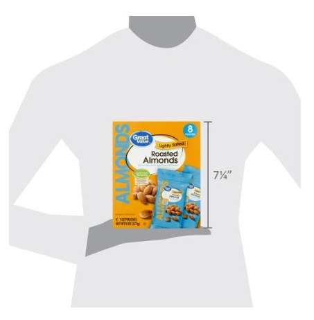 Taste the bold flavor and crunch of Great Value Lightly Salted Roasted Almonds. These 1-ounce packs are the perfect size to keep in your desk at work or in your purse or gym bag for a quick snack within easy reach. With six grams of protein per serving, these tasty nuts will keep you full of energy for whatever the day throws your way. The delightful flavor of these almonds will be a hit when you share them with friends, family, and coworkers. Grab a handful whenever you want to satisfy your snack craving. These whole almonds are packaged in convenient 1-ounce packages (8 count to a box) that are ideal for packing on road trips, tailgates, lunches and picnics. Make your taste buds sing with Great Value Lightly Salted Roasted Almonds.