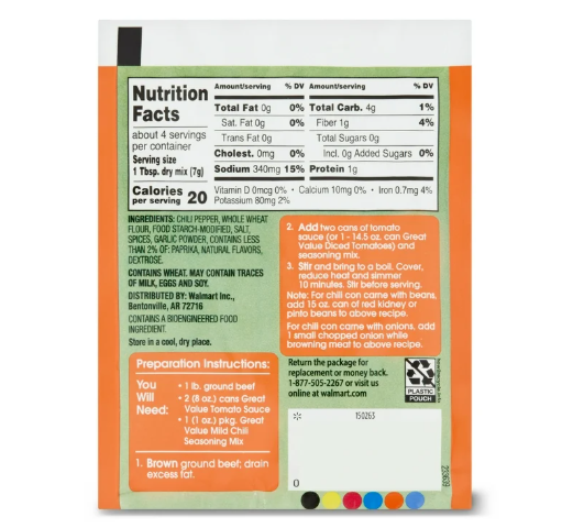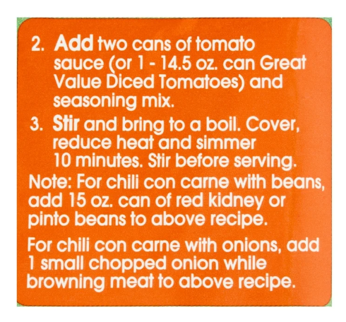 Preparation Instructions: **You Will Need: **1 (1 oz.) pkg. Great Value Mild Chili Seasoning Mix **1 lb. ground beef **2 (8 oz.) cans Great Value Tomato Sauce **1. Brown ground beef; drain excess fat. **2. Add two cans tomato sauce and seasoning mix. **3. Stir and bring to a boil. Cover, reduce heat and simmer 10 minutes. Stir before serving. **Makes 4 servings.