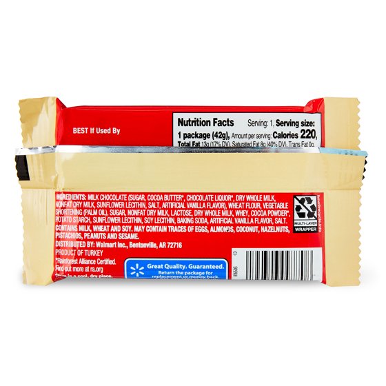 Great Value Milk Chocolate Crispy Wafer Bar is a satisfying snack that the entire family will enjoy. Packed with creamy milk chocolate this wafer bar is made with Rainforest Alliance certified cocoa. The wafer bar has a satisfying crispy texture for the perfect sweet treat. This bar is great for snacking on the go or for packing in lunches. Add some sweetness to your snack time with Great Value Milk Chocolate Crispy Wafer Bar.