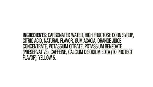 Carbonated Water, High Fructose Corn Syrup, Citric Acid, Natural Flavor, Gum Acacia, Orange Juice Concentrate, Potassium Citrate, Potassium Benzoate(Preservative), Caffeine, Calcium Disodium EDTA, FD&C Yellow #5