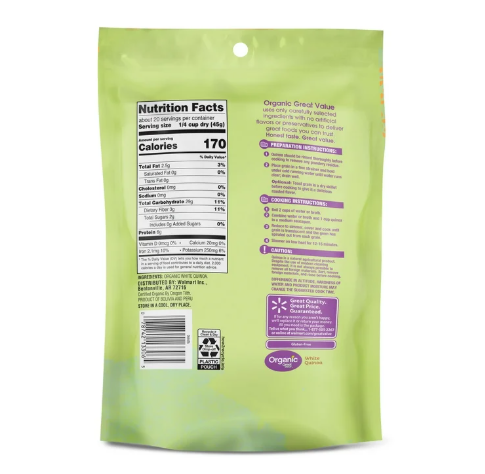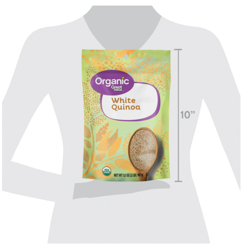 Enjoy the wholesome taste and hearty nutrition of white quinoa with Great Value Organic White Quinoa. Quinoa is a complete protein, containing all nine essential amino acids, and is a great source of calcium and other nutrients. White quinoa has the most delicate flavor of any quinoa variety and cooks up into a delightful, fluffy side dish in place of rice or potatoes. It's USDA certified organic, and free of artificial flavors or preservatives, so you can be confident you're serving your family the best nature has to offer. Switch up your grains with Great Value Organic White Quinoa.