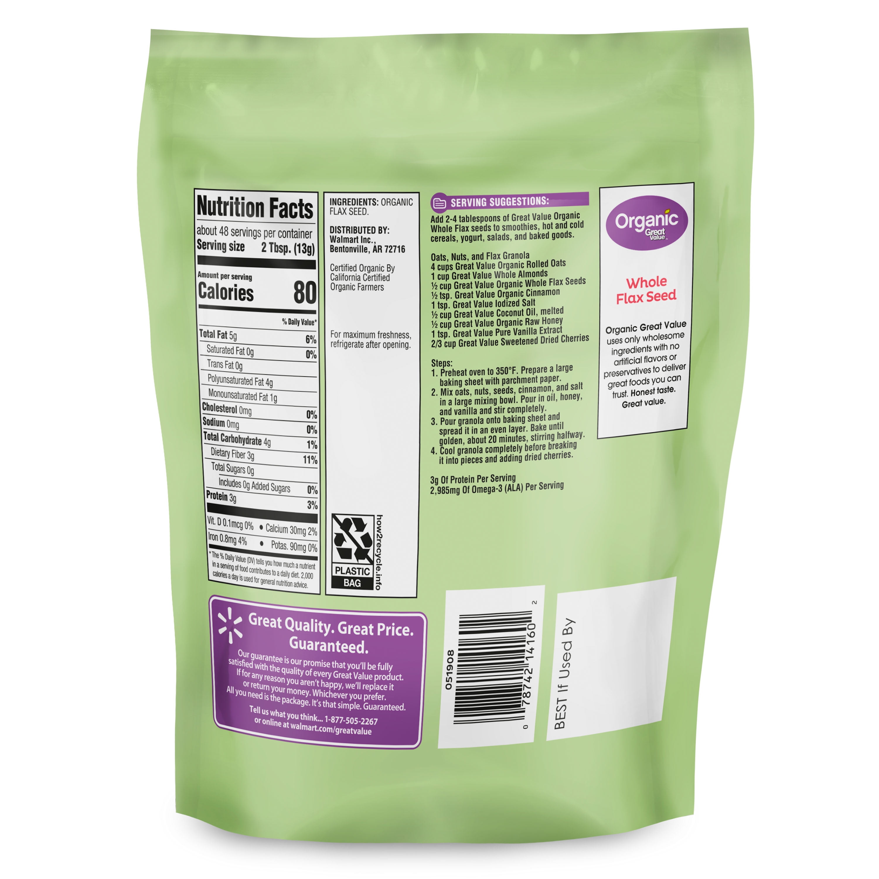 Great Value Organic Whole Flax Seed offers pure, wholesome nutrition in a 22-ounce package. Ideal for enhancing your favorite recipes, this versatile flax seed adds essential fiber and nutrients to baked goods like bread, pancakes, and banana bread. It's also perfect as a nutritious topping for yogurt or berries or blended into smoothies and shakes for an extra boost. USDA-certified organic and free from allergens, this flax seed contains no artificial flavors or preservatives, making it a great addition to your pantry. Enjoy the benefits of Great Value Organic Whole Flax Seed and elevate your diet with natural, high-quality nutrition.