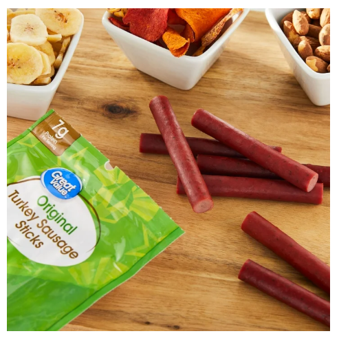 Make snack time more exciting when you purchase Great Value Turkey Sausage Snack Sticks 8oz. These original meat, shelf stable, fully cooked sticks are gluten free and perfect when you're on the road or need a quick protein boost in between meals. Featuring a rich smoked flavor, these turkey sticks are USDA inspected and ready to eat. Just grab them before your next hike or trip to the gym, or pack one in your kiddo's school lunch to ensure they're getting important nutrients. The sticks come in a handy, resealable plastic package, making it easy to store after opening. It's time to step it up a notch with Great Value Turkey Sausage Sticks! Great Value products provide families with affordable, high-quality grocery and household consumable options. With our wide range of product categories spanning grocery and household consumables, we offer you a variety of products for your family's needs. Our products are conveniently available online and in Walmart stores nationwide, allowing you to stock up and save money at the same time.
