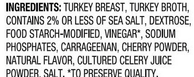 Turkey Breast, Turkey Broth, Contains 2% or Less of Sea Salt, Dextrose, Food Starch-Modified, Vinegar*, Sodium Phosphates, Carrageenan, Cherry Powder, Natural Flavor, Cultured Celery Juice Powder, Salt. *To Preserve Quality.