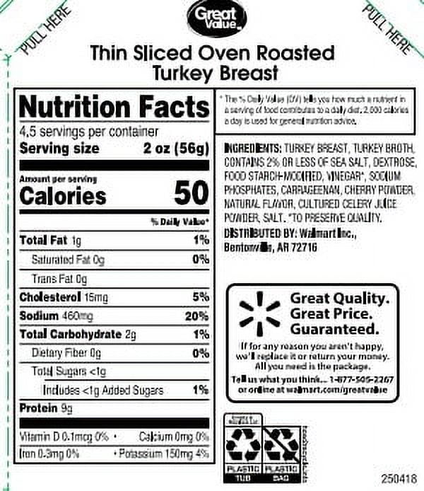 Lunch time just got better with Great Value Thin Sliced Gluten Free Oven Roasted Turkey Breast Lunchmeat 16 Oz Family Pack. Elevate your next sandwich, add a few slices onto your next club salad, make a sandwich or wrap. Our Oven Roasted Turkey contains no added nitrites or nitrates, artificial flavors, or artificial preservatives, with 9 g of protein per 2 oz serving you know you're choosing a wholesome product. When hunger strikes, reach for Great Value Oven Roasted Turkey. With a resealable plastic tub with 2- 8 oz fresh packs, this lunchmeat is kept fresh for the whole family.