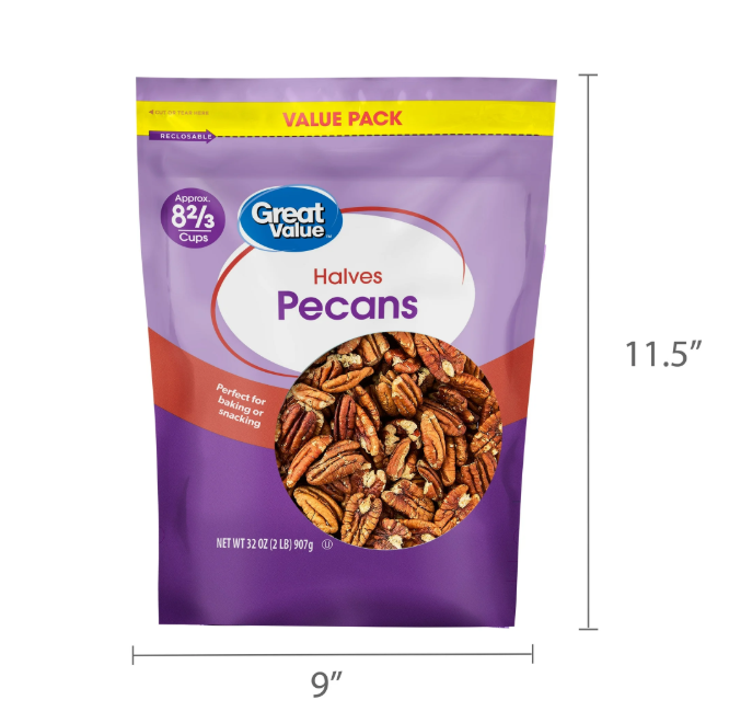 The perfect choice for adding texture and flavor to your home-baked goods is found in a bag of our Great Value Pecan Halves. These pecans add a satisfying crunch and delightfully nutty flavor to all your favorite desserts. Use them as a topping on pies; brownies; and cakes, mix them with all your favorite nuts; candies; and dried fruits to create a personalized trail mix, or you can even add them to salads for some delightful depth. Plus, we've even included our very own Caramel Pecan Pie recipe on the back of the packaging if you're looking for some inspiration. Pecans offer a nutritional benefit as they are a good source of dietary fiber. Great Value Pecan Halves are packaged in a resealable bag, making it easy to keep them fresh after every baking session. Add some crunch to your day with our Great Value Pecan Halves.