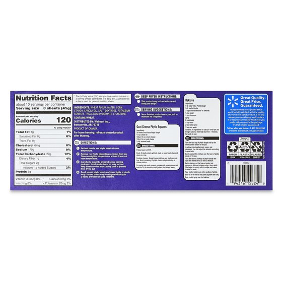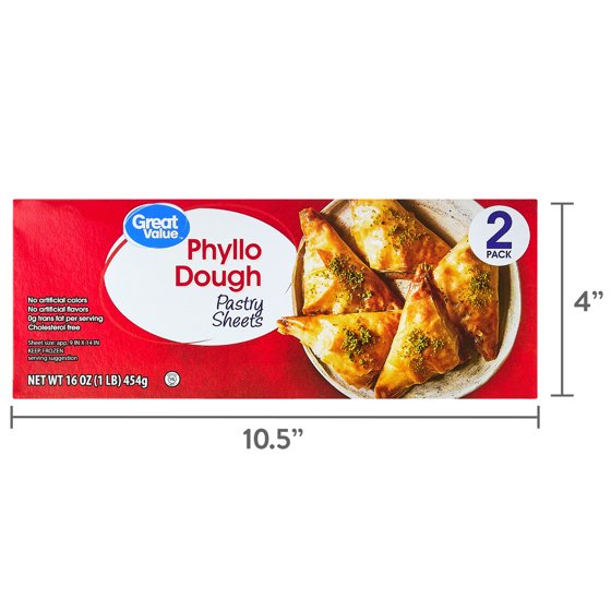 Great Value Phyllo Dough Pastry Sheets. Allergens Not Contained are Peanut, Sesame, Dairy, Egg, Soy, Fish, Tree Nut