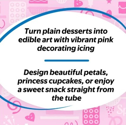 Upgrade your sweet treats with Great Value Pink Decorating Icing. Our yummy pink icing is the perfect topping for your delicious desserts and culinary creations. Design beautiful petals for a cluster of decorative flowers, design princess cupcakes, or simply enjoy a little dollop straight from the tube for a sweet snack. If you have icing left over, put some on graham crackers for a quick dessert the whole family will love. The culinary possibilities are virtually endless when you choose Great Value Pink Decorating Icing.