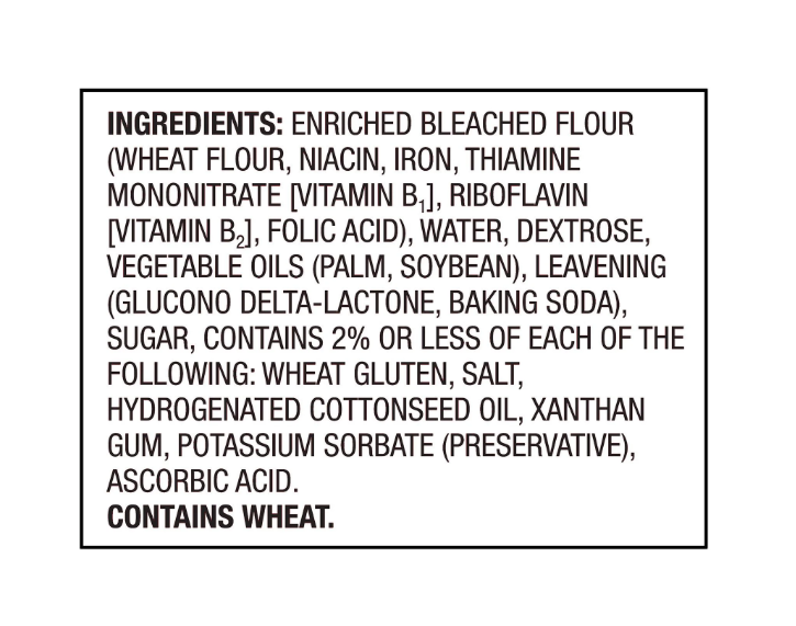ENRICHED BLEACHED FLOUR (WHEAT FLOUR, NIACIN, REDUCED IRON, THIAMIN MONONITRATE [VITAMIN B1], RIBOFLAVIN [VITAMIN B2], FOLIC ACID), WATER, DEXTROSE, VEGETABLE OIL (PALM, SOYBEAN), LEAVENING (GLUCONO-DELTA-LACTONE, BAKING SODA), SUGAR, CONTAINS LESS THAN 2%OF SALT, WHEAT GLUTEN, HYDROGENATED COTTONSEED OIL, XANTHAN GUM, POTASSIUM SORBATE (PRESERVATIVE), ASCORBIC ACID. CONTAINS: WHEAT.