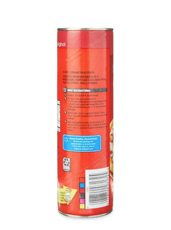 Peel in direction of arrow to remove label. Press spoon at seam. Twist can to open. **Oven cook - From Chilled **1. Preheat oven to 425°F. Unroll dough. **2. For thin crust: Press out dough to 15 x 10-inch rectangle on greased baking sheet. For thick crust: Press out dough into a 13 x 9-inch greased baking pan or 12-inch greased pizza pan. **3. Spread with 1/2 to 1 cup Great Value Pizza Sauce. Top with cooked meat, cheese and other toppings. **4. Bake until golden brown. Cheese pizza: 9-13 minutes for thin crust, 14-16 minutes for thick crust. Add 2-4 minutes if additional toppings are added.
