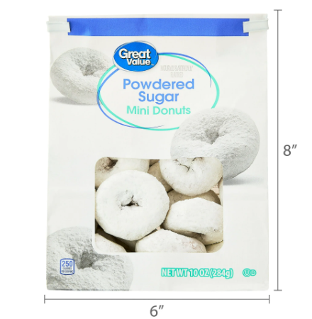 Start your morning off right with a sweet and satisfying Great Value Powdered Sugar Mini Donut. This package includes about 20 mini donuts that are great for breakfast, a midday snack, or an after-dinner dessert. They're an exciting treat to pack in a school lunch or in a picnic basket for a sweet surprise. With a powdered sugar coating, our mini donuts are an irresistible pairing for a cup of coffee or a cold glass of milk. Satisfy your sweet tooth at any time of day with a Great Value Powdered Sugar Mini Donut.