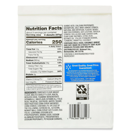ENRICHED FLOUR (WHEAT FLOUR, MALTED BARLEY FLOUR, NIACIN, REDUCED IRON, THIAMINE MONONITRATE [VITAMIN B1], RIBOFLAVIN [VITAMIN B2], FOLIC ACID), PALM OIL, DEXTROSE, WATER, SUGAR, HIGH FRUCTOSE CORN SYRUP, MODIFIED CORN STARCH, CONTAINS 2% OR LESS OF THE FOLLOWING: SOYBEAN OIL, GLYCERIN, NONFAT MILK, CORN SYRUP, SOY FLOUR, EGG YOLKS, LEAVENING (SODIUM ACID PYROPHOSPHATE, BAKING SODA, SODIUM ALUMINUM PHOSPHATE), PRESERVATIVES (SODIUM PROPIONATE, POTASSIUM SORBATE, SORBIC ACID, CALCIUM PROPIONATE, NATAMYCIN), SALT, WHEY, WHEAT STARCH, NATURAL AND ARTIFICIAL FLAVOR, MONO- AND DIGLYCERIDES, SOY LECITHIN, TAPIOCA STARCH, CELLULOSE GUM, KARAYA GUM, GUAR GUM, ENZYMES, CITRIC ACID, NUTMEG OIL, COLOR (TITANIUM DIOXIDE, TURMERIC, ANNATTO), COCONUT. CONTAINS: WHEAT, MILK, EGGS, SOY, COCONUT. MADE IN A FACILITY THAT ALSO CONTAINS PECANS AND WALNUTS. “Contains a Bioengineered Food Ingredient.”