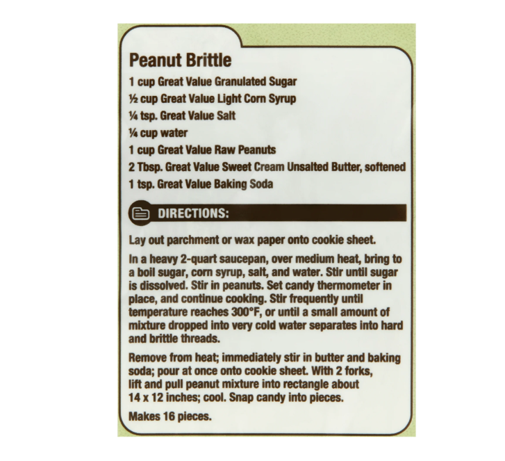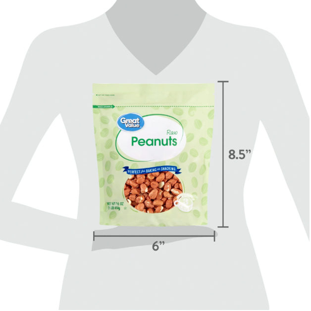 Great Value Raw Peanuts are perfect for both baking and snacking. These peanuts add a satisfying crunch and texture to all your favorite desserts. Use them as a topping on pies, brownies, cakes, and ice cream sundaes. Mix them with all your favorite nuts, candies, and dried fruits to create a personalized trail mix. For a delicious treat, follow our delightful peanut brittle recipe located on the back of the packaging. They come inside a resealable bag, making it easy to keep them fresh after every snack. Add some crunch to your day with Great Value Raw Peanuts. Great Value products provide families with affordable, high-quality grocery and household consumable options. With our wide range of product categories spanning grocery and household consumables, we offer you a variety of products for your family's needs. Our products are conveniently available online and in Walmart stores nationwide, allowing you to stock up and save money at the same time.
