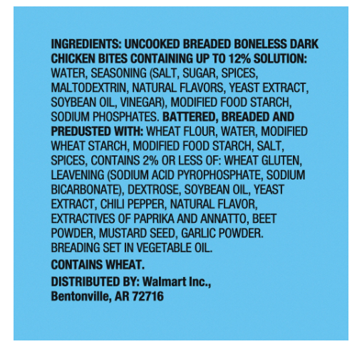 UNCOOKED BREADED BONELESS DARK CHICKEN NUGGETS CONTAINING UP TO 12% SOLUTION OF: Water, seasoning (salt, sugar, spices, maltodextrin, natural flavors, yeast extract, soybean oil, vinegar), modified food starch, sodium phosphates. Battered, breaded and predusted with: Wheat flour, water, modified wheat starch, modified food starch, salt, spices, contains 2% or less of: wheat gluten, leavening (sodium acid pyrophosphate, sodium bicarbonate), dextrose, soybean oil, yeast extract, chili pepper, natural flavor, extractives of paprika and annatto, beet powder, mustard seed, garlic powder. Breading set in vegetable oil. CONTAINS: WHEAT.