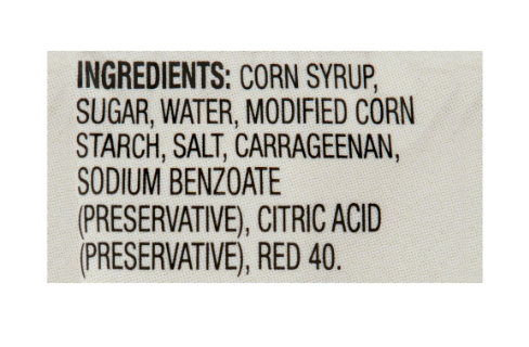 Corn Syrup, Sugar, Water, Modified Cornstarch, Salt, Carrageenan, Sodium Benzoate (Preservative), Citric Acid (Preservative), Red 40