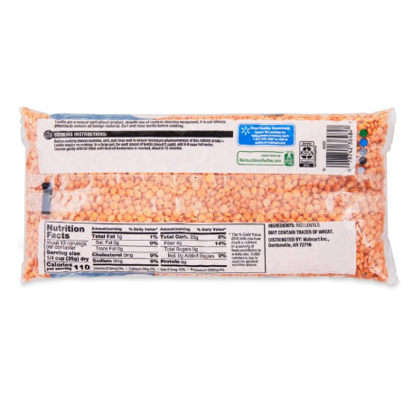 Try Great Value Red Lentils for a great mealtime option. A good source of iron, fiber, and protein, this legume adds substance to soups, stews, and salads alike. Make a red lentil chili for a fresh twist on the gameday classic or try a simple red lentil curry for a warm, comforting meal. An excellent choice for vegans and vegetarians, these lentils are gluten free and a filling way to get essential nutrients typically found in animal proteins. There is no soaking required, and they are ready to eat in just 6-12 minutes when boiled in water. Great Value Red Lentils are great for you, and easy to prepare.
