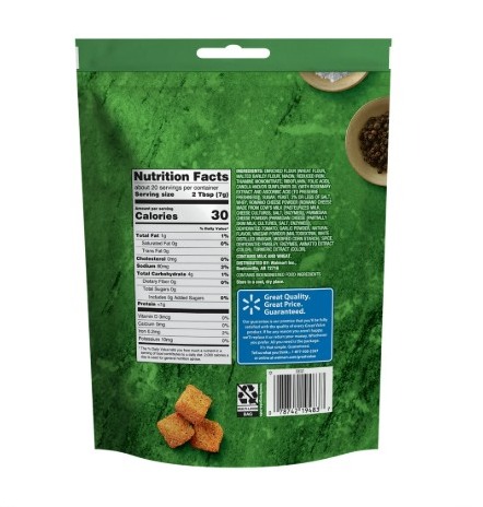 Spruce up dinner tonight with Great Value Seasoned Croutons. These ready-to-eat, delicious croutons are oven baked to a wonderful golden brown and seasoned to perfection with a scrumptious blend of herbs, cheese, and spices. Add them to your favorite salad recipe for a yummy crunch, top your favorite casseroles or macaroni and cheese, or use them to make tasty stuffing this Thanksgiving. They are packaged in a convenient, five-ounce resealable bag that helps maintain freshness after opening. With 20 servings per container these croutons can help spice up dinner for the whole family. Bring home and enjoy Great Value Seasoned Croutons today! Great Value products provide families with affordable, high-quality grocery and household consumable options. With our wide range of product categories spanning grocery and household consumables, we offer you a variety of products for your family's needs. Our products are conveniently available online and in Walmart stores nationwide, allowing you to stock up and save money at the same time.