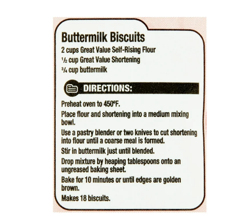 . Buttermilk Biscuits. 2 cups Great Value Self-Rising Flour. 1/2 cup Great Value All-Vegetable Shortening. 3/4 cup buttermilk. Directions:. Preheat oven to 450°F. Place the flour and shortening in a medium mixing bowl. Use a pastry blender, or two knives, to cut the shortening into the flour until a coarse meal is formed. Stir in the buttermilk just until blended. Drop mixture by heaping tablespoons onto an ungreased baking sheet. Bake for 10 minutes or until the edges are golden brown. Makes 18 biscuits.
