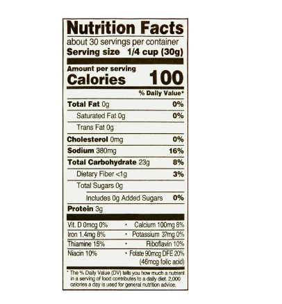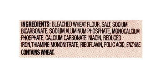 Ingredients: Bleached Wheat Flour, Salt, Sodium Bicarbonate, Sodium Aluminum Phosphate, Monocalcium Phosphate, Malted Barley Flour, Niacin, Reduced Iron, Thiamine Mononitrate Riboflavin, Folic Acid.