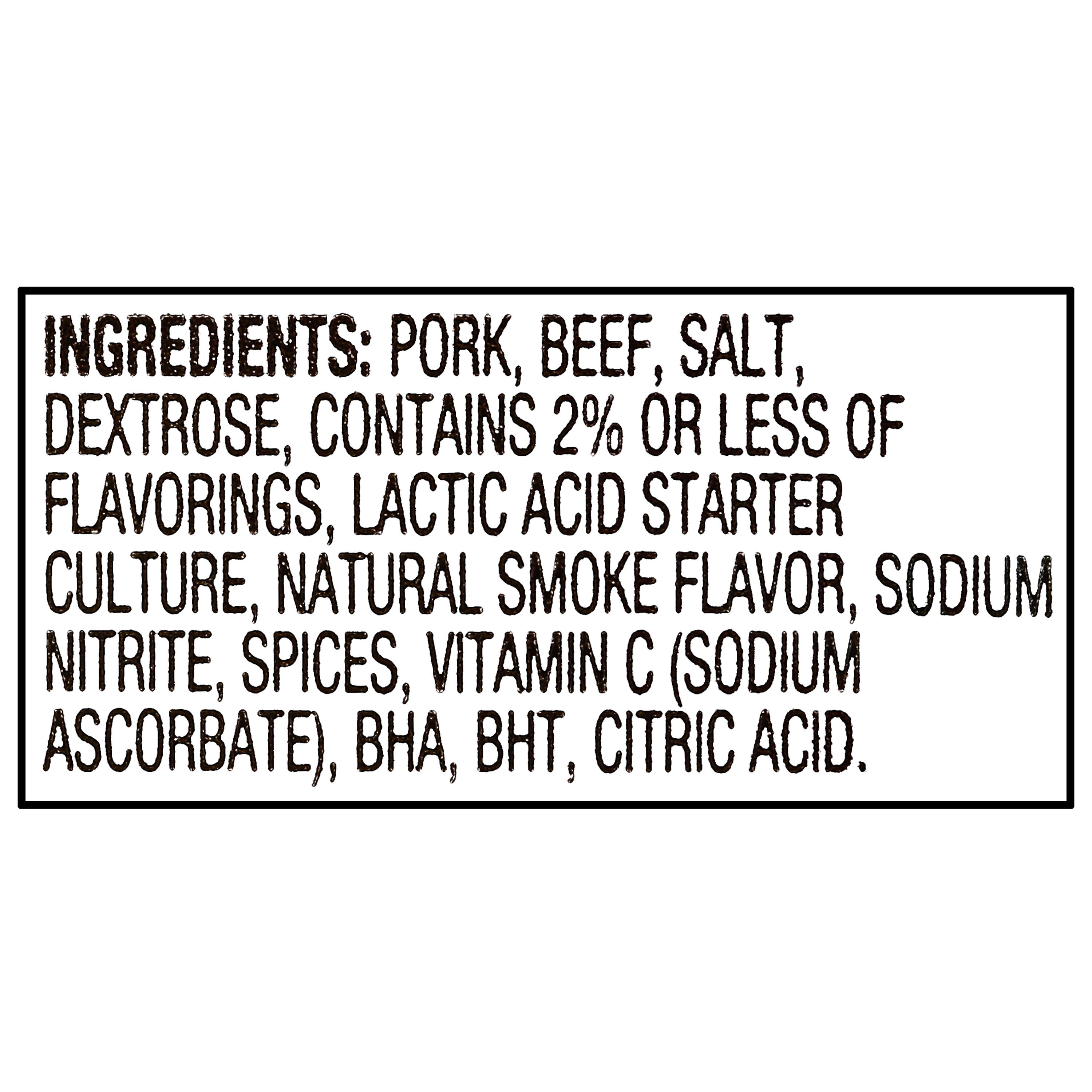 PORK, BEEF, SALT, DEXTROSE, CONTAINS 2% OR LESS OF FLAVORINGS, LACTIC ACID STARTER CULTURE, NATURAL SMOKE FLAVOR, SODIUM NITRITE, SPICES, VITAMIN C (SODIUM ASCORBATE), BHA, BHT, CITRIC ACID.