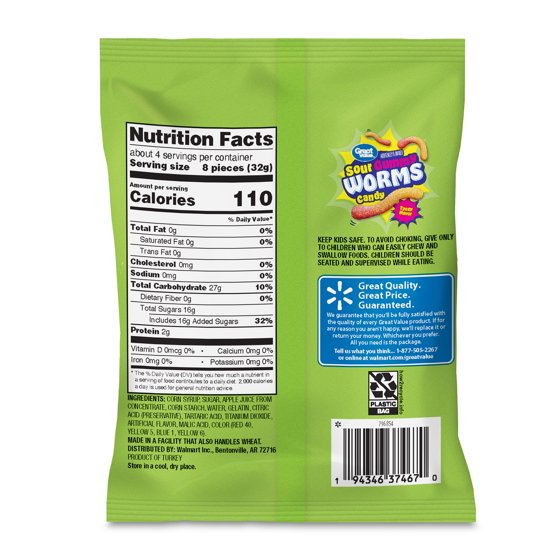 Enjoy the soft, chewy texture, and tangy flavor of Great Value Sour Gummy Worms Candy. These classically cute worm-shaped candies are great for kids and kids at heart. Though each worm is small and adorable, they pack in tons of flavor. Don't feel bad when you give in to your sweet tooth - our gummy snacks are gluten-free and contain only 110 tiny calories per serving. Go ahead and grab a few more tangy worms. Indulge in the delicious taste of Great Value Sour Gummy Worms Candy and satisfy your candy cravings.