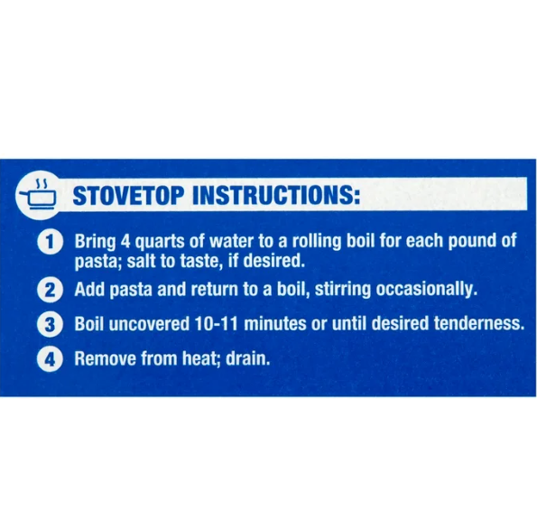 Lift tab to open **Stovetop - From Ambient **Stovetop Instructions: **1. Boil 4 quarts of water for each pound of dry spaghetti; if desired, add 1 tsp. salt. **2. Add spaghetti and return to a boil. **3. Cook uncovered approximately 10-11 minutes, or until tender, stirring occasionally. Avoid overcooking. **4. Remove from heat and drain.