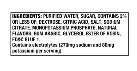 PURIFIED WATER, SUGAR, CONTAINS 2% OR LESS OF: DEXTROSE, CITRIC ACID, SALT, SODIUM CITRATE, MONOPOTASSIUM PHOSPHATE, NATURAL FLAVORS, GUM ARABIC, GLYCEROL ESTER OF ROSIN, FD&C BLUE 1.