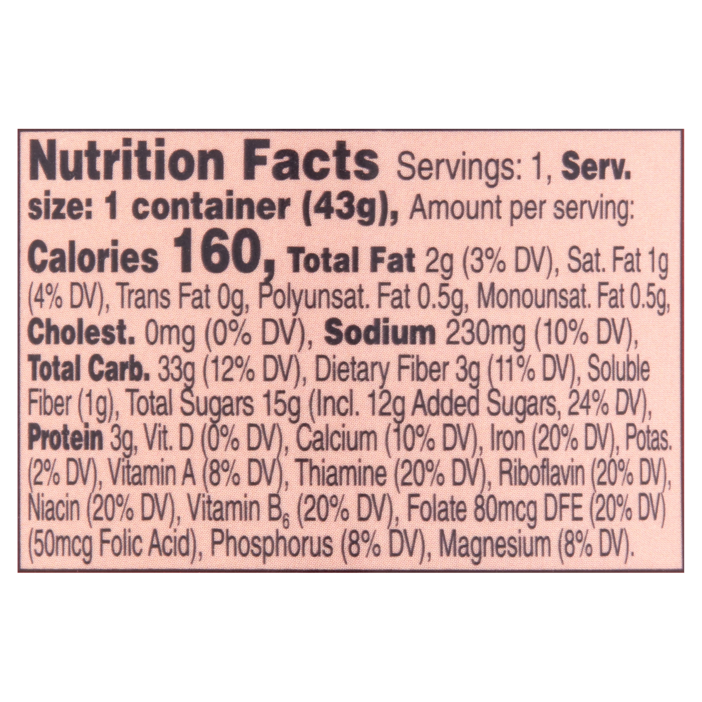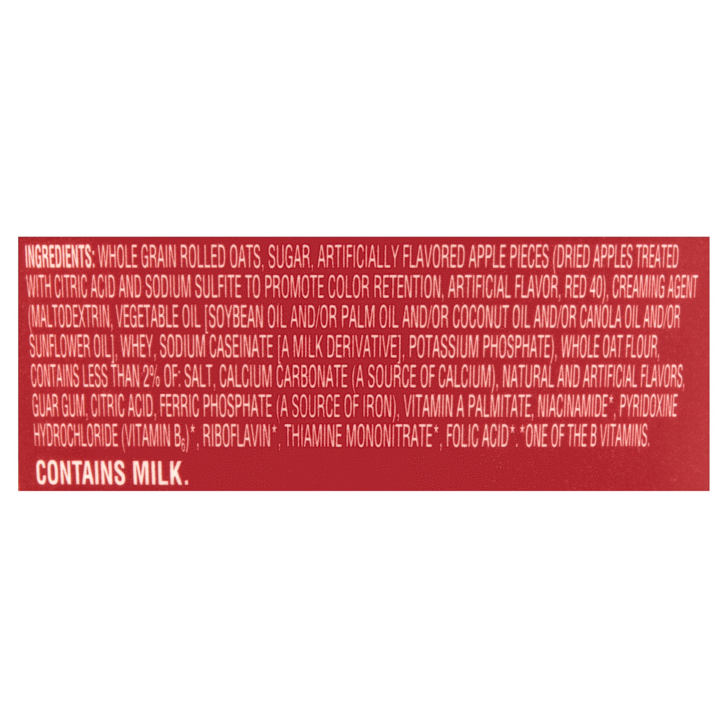 Whole Grain Rolled Oats, Sugar, Artificially Flavored Apple Pieces (Dried Apples treated with Citric Acid and Sodium Sulfite to promote color retention, Artificial Flavor, Red 40), Creaming Agent (Maltodextrin, Vegetable Oil [Soybean Oil and/or Palm Oil and/or Coconut Oil and/or Canola Oil and/or Sunflower Oil], Whey, Sodium Caseinate [a Milk Derivative], Potassium Phosphate), Whole Oat Flour, Contains less than 2% of: Salt, Calcium Carbonate (a source of Calcium), Natural and Artificial Flavors, Guar Gum, Citric Acid, Ferric Phosphate (a source of Iron), Vitamin A Palmitate, Niacinamide*, Pyridoxine Hydrochloride (Vitamin B6), Riboflavin, Thiamine Mononitrate*, Folic Acid*, *One of the B Vitamins.