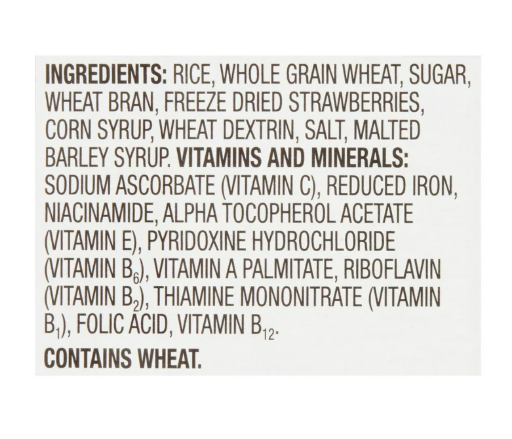 Rice, Whole Grain Wheat, Sugar, Wheat Bran, Dried Strawberries, Soluble Wheat Fiber, Corn Syrup, Salt, Barley Malt Extract