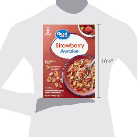 Wake up to the delicious taste of Great Value Awake Strawberry Cereal. This scrumptious cereal pairs crunchy whole grain wheat and rice flakes with real strawberries. Serve with your favorite milk or enjoy it by the handful as a sweet treat. At only 140 calories per serving and with 10 vitamins and minerals in every serving, as well as being a good source of fiber, you can be happy knowing your family is enjoying a great breakfast offering.