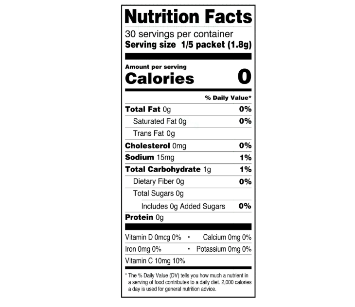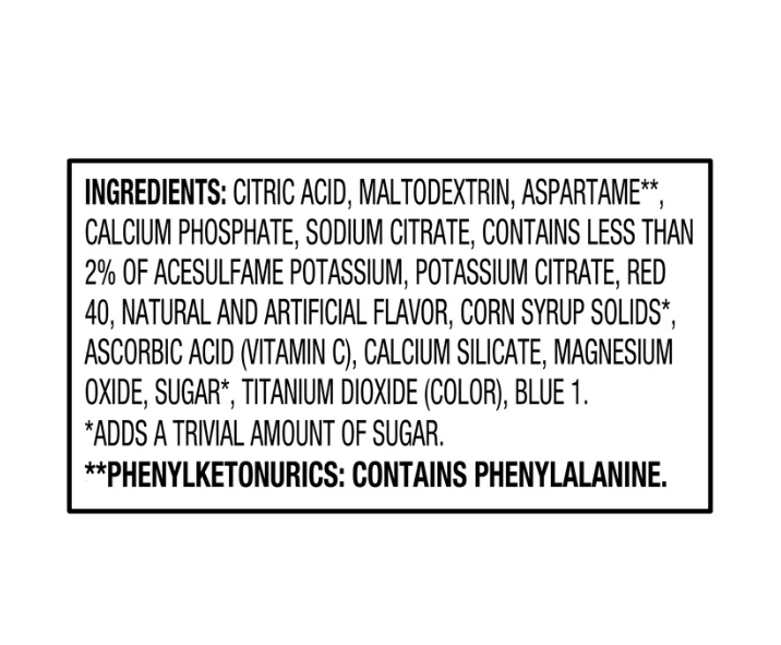 CITRIC ACID, MALTODEXTRIN, ASPARTAME**, CALCIUM PHOSPHATE, SODIUM CITRATE, CONTAINS LESS THAN 2% OF ACESULFAME POTASSIUM, POTASSIUM CITRATE, RED 40, ASCORBIC ACID (VITAMIN C), NATURAL AND ARTIFICIAL FLAVORS, CORN SYRUP SOLIDS*, CALCIUM SILICATE, MAGNESIUM OXIDE, SUGAR*, ARTIFICIAL COLOR, BLUE 1.*ADDS A TRIVIAL AMOUNT OF SUGAR.**PHENYLKETONURICS: CONTAINS PHENYLALANINE.