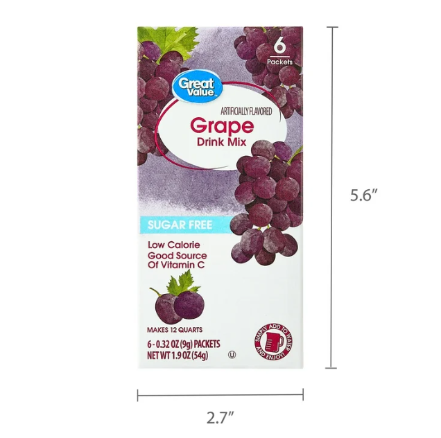 Great Value Sugar-Free Grape Drink Mix delivers a burst of delicious fruit flavor in every sip. This drink mix makes it easy to enjoy a healthy beverage at home, in the office or on the go. It is great for health conscious individuals as it is sugar free and contains only five calories per serving. It also offers nutritional benefits as it is a good source of vitamin C. This pack comes with six individual packets of drink mix, which makes a total of 12 quarts. Just add to water and watch this flavorful beverage come to life. Quench your thirst with the refreshing taste of Great Value Sugar-Free Grape Drink Mix.