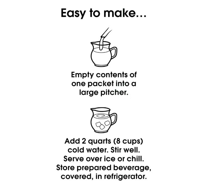 Easy to make... **Empty contents of one packet into a large pitcher. **Add 2 quarts (8 cups) cold water. Stir well. Serve over ice or chill.