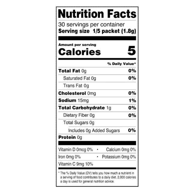 Maltodextrin, malic acid, citric acid, aspartame**, sodium citrate, acesulfame potassium, contains less than 2% of: artificial flavor, ascorbic acid (vitamin C), calcium silicate, red 40, magnesium oxide, blue 1, corn syrup solids*. *adds a trivial amount of sugar. **Phenylketonurics: contains phenylalanine