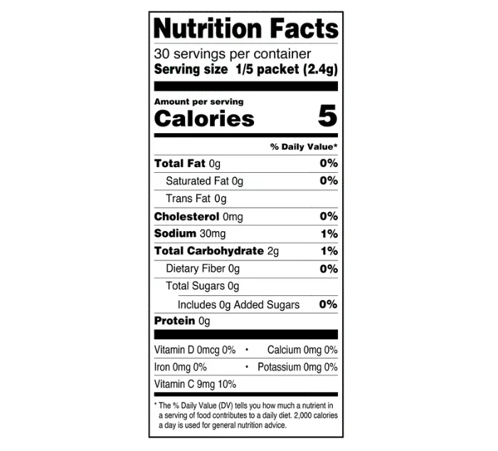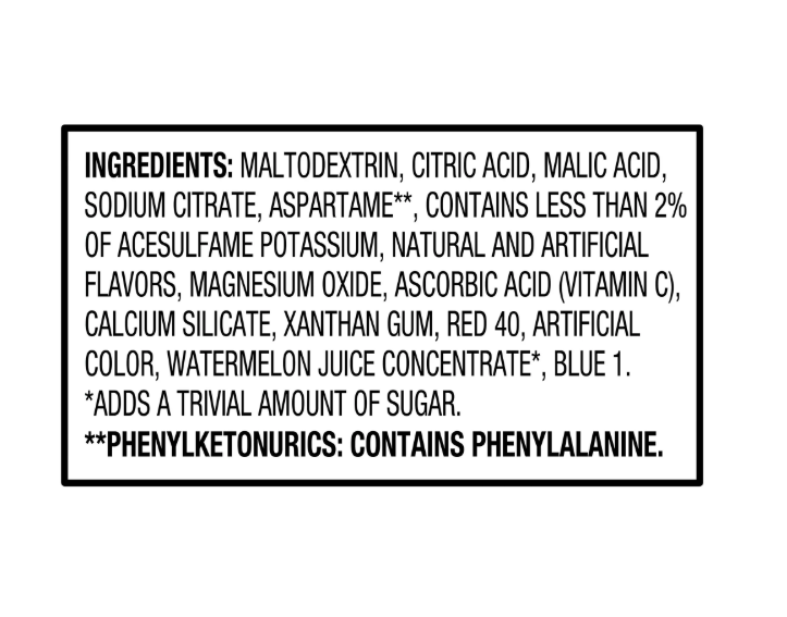 MALTODEXTRIN, CITRIC ACID, MALIC ACID, SODIUM CITRATE, ASPARTAME**, CONTAINS LESS THAN 2% OF ACESULFAME POTASSIUM, NATURAL AND ARTIFICIAL FLAVORS, MAGNESIUM OXIDE, ASCORBIC ACID (VITAMIN C), CALCIUM SILICATE, XANTHAN GUM, RED 40, ARTIFICIAL COLOR, WATERMELON JUICE CONCENTRATE*, BLUE 1.*ADDS A TRIVIAL AMOUNT OF SUGAR.**PHENYLKETONURICS: CONTAINS PHENYLALANINE.