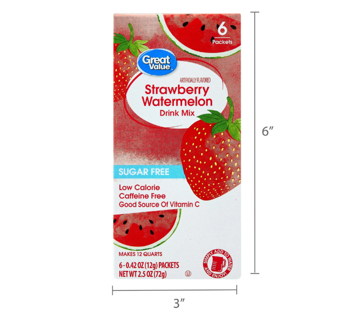 Great Value Sugar-Free Strawberry Watermelon Drink Mix Sweeten your day with Great Value Sugar-Free Strawberry Watermelon Drink Mix. This low-calorie drink has a refreshing strawberry watermelon flavor that is sure to quench your thirst. All you need to do is add water. This drink mix comes with 6 packets and makes up to 12 quarts, so there is plenty for you to share with friends and family. It is sugar free, contains only five calories per serving and is a good source of Vitamin C. You can enjoy this refreshing drink by the pool, at your next barbecue, birthday party, get together or anytime you feel like sipping on something sweet. Bring home Great Value Sugar-Free Strawberry Watermelon Drink Mix today.< />< />Great Value products provide families with affordable, high quality grocery and household consumable options. With our wide range of product categories spanning grocery and household consumables, we offer you a variety of products for your family's needs. Our products are conveniently available online and in Walmart stores nationwide, allowing you to stock up and save money at the same time.