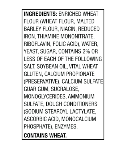 ENRICHED UNBLEACHED WHEAT FLOUR (WHEAT FLOUR, MALTED BARLEY FLOUR, NIACIN, REDUCED IRON, THIAMIN MONONITRATE, RIBOFLAVIN AND FOLIC ACID), WATER, YEAST, SUGAR, CONTAINS 2% OR LESS OF EACH OF THE FOLLOWING: SALT, SOYBEAN OIL, VITAL WHEAT GLUTEN, CALCIUM PROPIONATE (MOLD INHIBITOR), CALCIUM SULFATE, GUAR GUM, SUCRALOSE, MONOGLYCERIDES, YEAST NUTRIENT (AMMONIUM SULFATE), DOUGH CONDITIONERS (SODIUM STEAROYL LACTYLATE, ASCORBIC ACID, MONOCALCIUM PHOSPHATE), ENZYMES.