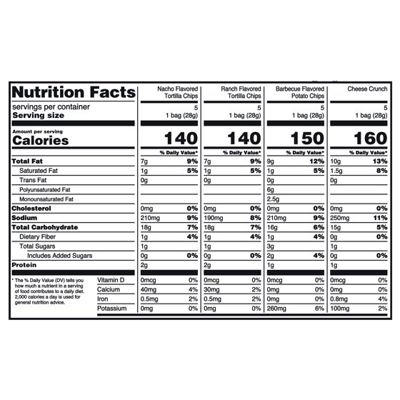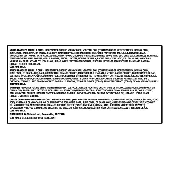 INGREDIENTS: GROUND YELLOW CORN, VEGETABLE OIL (CONTAINS ONE OR MORE OF THE FOLLOWING: CORN, SUNFLOWER, OR CANOLA OIL), SALT, CORN STARCH, TOMATO POWDER, MONOSODIUM GLUTAMATE, LACTOSE, GARLIC POWDER, ONION POWDER, SUGAR, DEXTROSE, WHOLE MILK POWDER, CORN MALTODEXTRIN, CULTURED BUTTERMILK (BUTTERMILK, WHEY, LACTIC ACID), MALIC ACID, CORN SYRUP SOLIDS, SPICES, WHEY POWDER, DISODIUM MOSINATE AND DISODIUM GUANYLATE, CITRIC ACID, CHEDDAR CHEESE (CULTURED PASTEURIZED MILK, SALT, ENZYMES), YELLOW 5 LAKE, SODIUM ACETATE, NATURAL FLAVORING, TITANIUM DIOXIDE (COLOR), TURMERIC EXTRACT (COLOR), RED 40, YELLOW 5, BLUE 1.