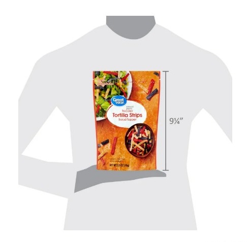 Great Value Tri-Color Tortilla Strips are crunchy and colorful toppings for your favorite salads, soups, and more. Add extra zing and color to any soup, salad, or casserole with these colorful tortilla strips. In addition to being used as a crispy topping, these tortilla strips can also be enjoyed as a snack with your favorite salsa dip. Great Value Tortilla Strips come in a convenient resealable package to help keep them fresh. Add some color and crunch to your meals with Great Value Tri-Color Tortilla Strips.Great Value products provide families with affordable, high-quality grocery and household consumable options. With our wide range of product categories spanning grocery and household consumables, we offer you a variety of products for your family's needs. Our products are conveniently available online and in Walmart stores nationwide, allowing you to stock up and save money at the same time