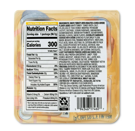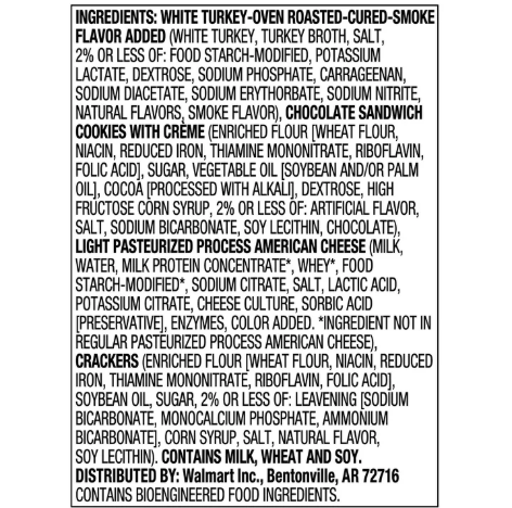 Turkey (White Turkey, Water, Corn Syrup, Modified Food Starch, Salt, Contains 2% Or Less Of Potassium Lactate, Sodium Phosphates, Sodium Diacetate, Sodium Erythorbate, Sodium Nitrite), Pasteurized Process American Cheese (Cultured Skim Milk And Milk, Water, Sodium Citrate, Salt, Potassium Citrate, Annatto And Paprika [Color], Cream, Enzymes, Sorbic Acid [Preservative], Sunflower Lecithin [Anti-Sticking Agent]), Crackers (Enriched Flour [Wheat Flour, Niacin, Reduced Iron, Thiamine Mononitrate, Riboflavin, Folic Acid], Soybean Oil, Sugar, Contains 2% Or Less Of: Leavening [Sodium Bicarbonate, Monocalcium Phosphate, Ammonium Bicarbonate], Corn Syrup, Salt, Natural Flavor, Soy Lecithin). ALLERGENS: Milk, Wheat, Soy. May Contain Egg, Tree Nuts (Pecans, Almonds, Coconut), and Peanuts.
