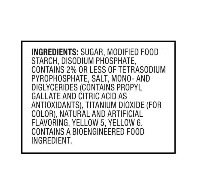 Sugar, Modified Food Starch, Disodium Phosphate, Contains 2% or less of Tetrasodium Pyrophosphate, Salt, Mono- and Diglycerides (contains Propyl Gallate and Citric Acid as Antioxidants), Titanium Dioxide (for color), Natural and Artificial Flavoring, Yellow 5, Yellow 6