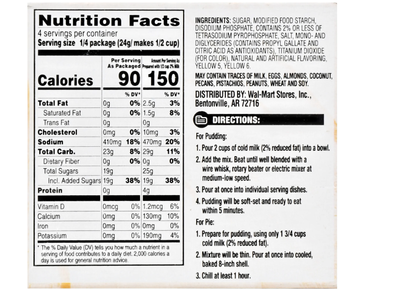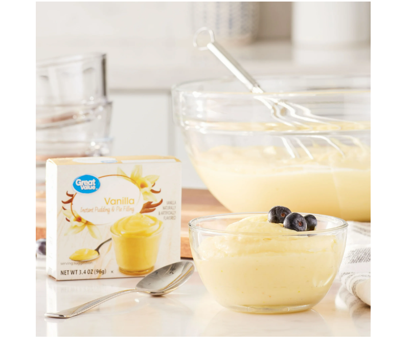 Great Value Vanilla Instant Pudding & Pie Filling is a rich and creamy dessert that can fit into your lifestyle. When prepared with half a cup of 2 percent milk, each serving of this mixture contains just 150 calories and includes an impressive four grams of belly-filling protein. Sprinkle a few dashes of cinnamon or nutmeg on this delicious pudding for a simple dessert, make a luscious mousse pie with cherries and nuts, or add a few spoonful's to a dessert shell and top with fresh berries. Embark on a culinary adventure with a box of Great Value Vanilla Instant Pudding & Pie Filling.