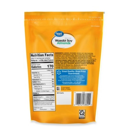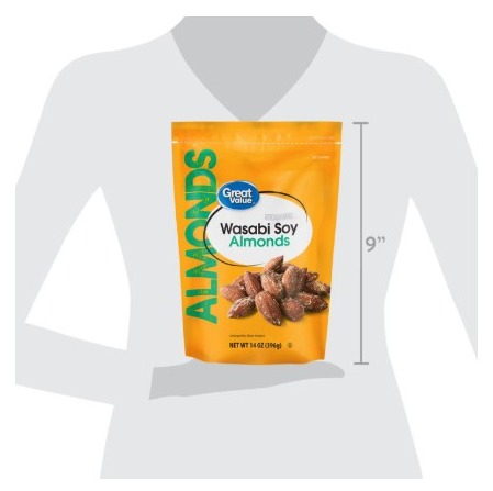 Make snack time more exciting when you bring home Great Value Wasabi Soy Almonds. With five grams of protein per serving, these almonds are great when you're on the road or need a quick boost in between meals. Just grab them before your next hike or trip to the gym, or pack some in your kiddo's school lunch to ensure they're getting important nutrients. These almonds come in a handy, resealable package, making them easy to store after opening. Make snack time great again with Great Value Wasabi Soy Almonds.