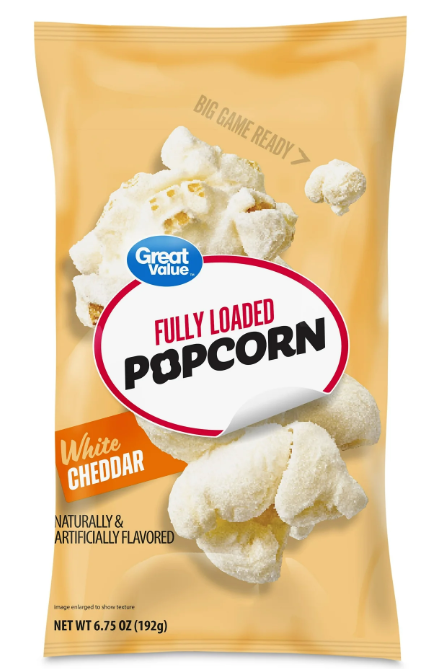 Great Value Fully Loaded White Cheddar Popcorn packs a flavorful punch with each handful. This white cheddar popcorn makes a great addition to any spread, whether it's snacking during the big game or a savory treat at a birthday party. Each bag contains 6.75 ounces of fluffy popcorn coated with white cheddar flavor. This bag of popcorn contains about 7 servings of irresistible snacking. Stock your pantry with Great Value Fully Loaded White Cheddar Popcorn.