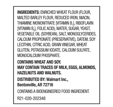 Enriched Wheat Flour (Flour, Malted Barley Flour, Reduced Iron, Niacin, Thiamine Mononitrate [Vitamin B1], Riboflavin [Vitamin B2], Folic Acid), Water, Sugar, Yeast, Soybean Oil, Salt, Monoglycerides, Calcium Propionate (Preservative), Datem, Calcium Sulfate, Soy Lecithin, Citric Acid, Grain Vinegar, Wheat Gluten, Potassium Iodate, Monocalcium Phosphate.