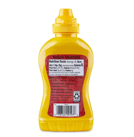 Great Value Yellow Mustard is a classic and delicious topping for your favorite grilled foods and much more. Use this tangy condiment on hot dogs, hamburgers, sausages, and chicken. Yellow mustard is also great on vegetables as is, or mix it with olive oil and lemon juice for an easy and delicious vinaigrette dressing. This mustard brings a ton of flavor to your dishes without any calories, fat, cholesterol, or sugar. Liven up an assortment of different sauces with this pantry staple. Mix with honey for your own honey mustard sauce. Coat your hamburger patties before grilling for added zip. Use mustard as a more flavorful binder than eggs before breading fish or chicken cutlets. This mustard comes in a convenient, squeezable 8-ounce plastic bottle for easy regular use, and travels well for outdoor picnics and meals. Great Value Yellow Mustard will bring zest and classic flavor to your meals.