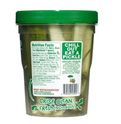 Grillo's Pickles Dill Spears are the OG. The original 100-year-old recipe first made straight from the backyard garden. Fresh dill and garlic right in the jar make Grillo's pickles unbelievably refreshing. Perfect as a side to your favorite sandwich or chopped up in tuna salad, these versatile pickles are ready to tackle any dish. Grillo's Dill Spears can also be enjoyed on their own as a great low calorie snack that satisfies your salty, crunchy cravings! The rectangular jar allows for easy, space-saving storage within your refrigerator. Crisp, clean, and fresh, each bite will have you coming back for more.