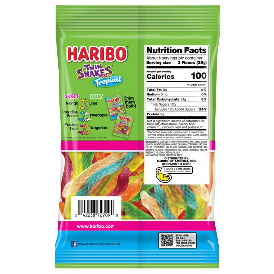 Harbio Twin Snakes Gummies Tropical Gummy Candy, 8oz, Share Size Peg Bag